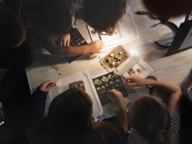 Atelier sur table à la recherche de coquilles vides dans un échantillon de sol .